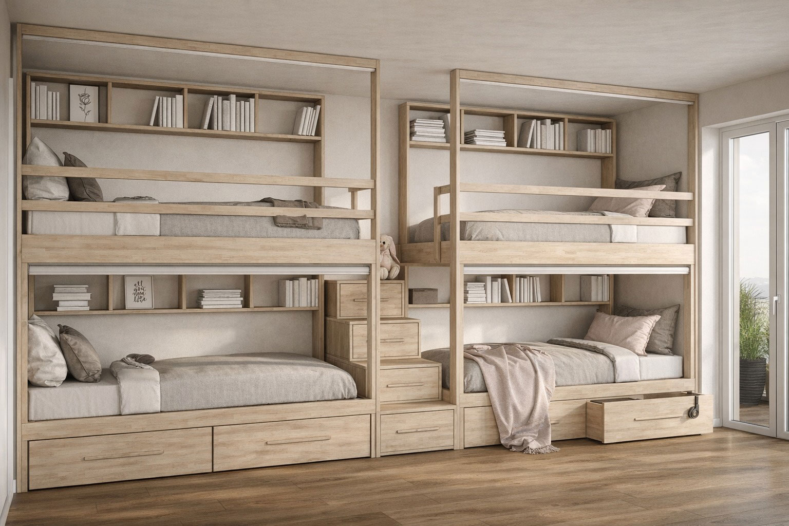 La nostra Scala a Cassettoni centrale è la soluzione perfetta per le case dove lo spazio per gli armadi scarseggia: ogni gradino è un capiente cassetto dove riporre abbigliamento sportivo, giochi o biancheria. Così, anche con tanti ospiti, la stanza rimane sempre in ordine. La sera, ogni letto diventa un angolo privato e sicuro, ideale per ricaricare le energie e svegliarsi pronti per una nuova avventura.